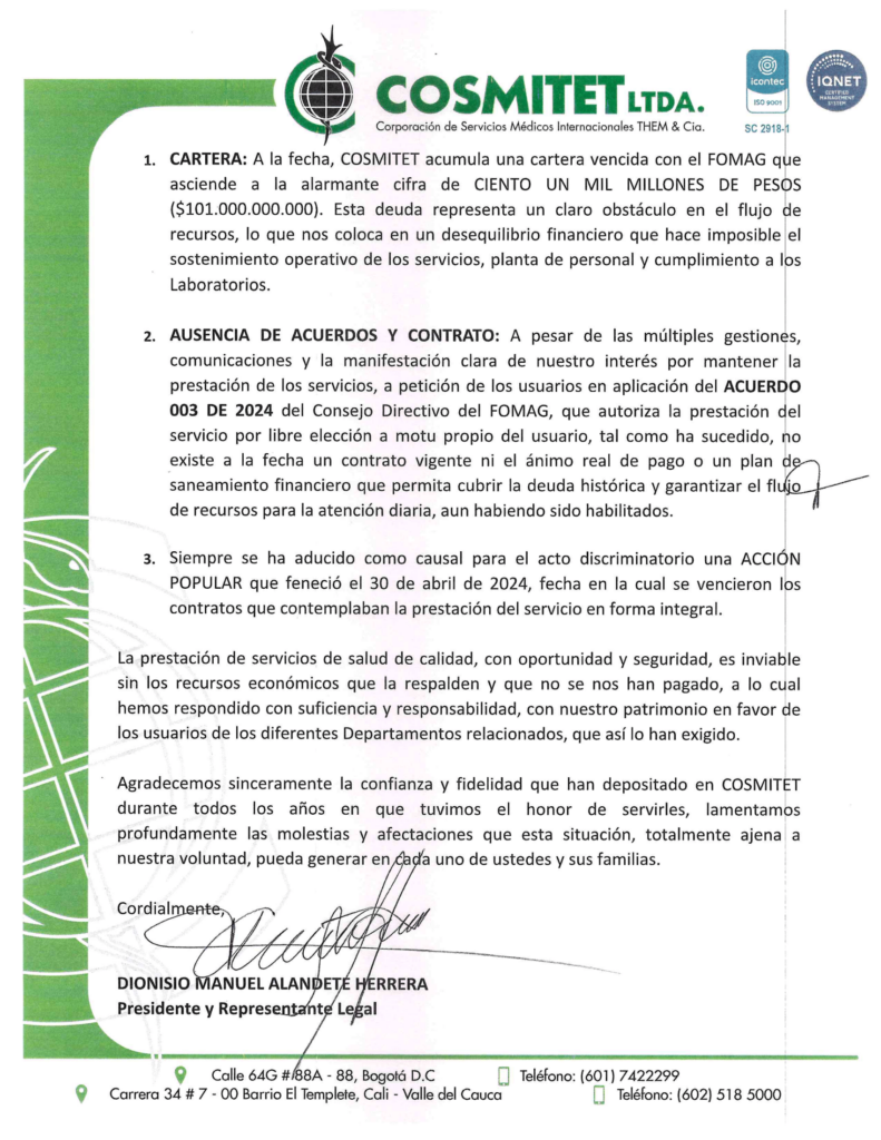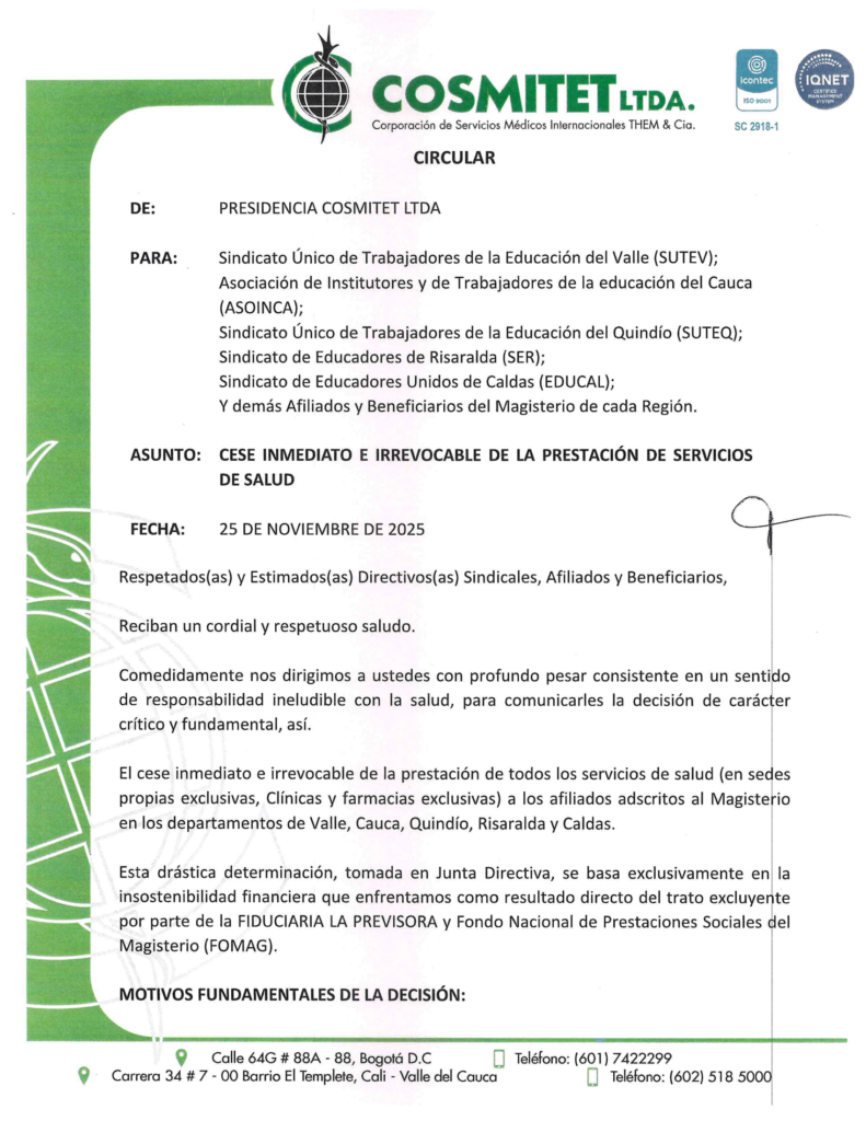 Circular cese inmediato e irrevocable de la prestación de servicios de salud